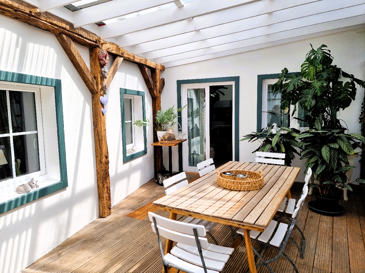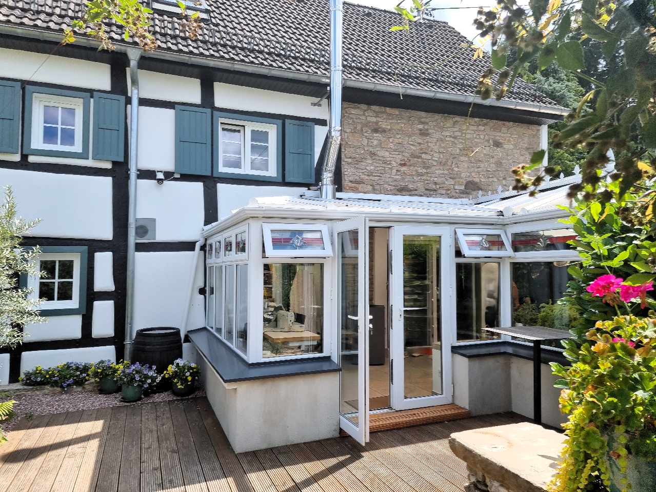 Die Sanierung wurde mit größter Sorgfalt und einem Auge für architektonische Details durchgeführt. Die charakteristische Fachwerkstruktur wurde erhalten und mit modernen Elementen harmonisch kombiniert.