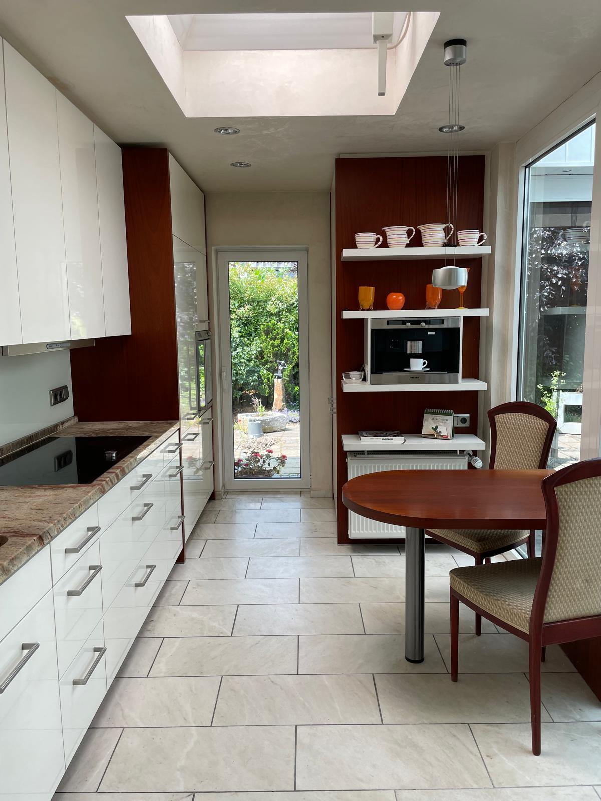 Von der modernen und zeitlos gestalteten Küche, inkl. Frühstücksecke gelangen Sie in das großzügige Esszimmer sowie auf die angrenzende, überdachte Terrasse mit Kamin. Auch hier stehen ihnen, wie im ganzen Haus, diverse Einbauschränke zur Verfügung.