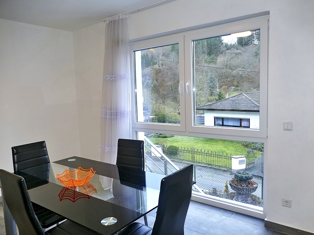 Der zugehörige Essbereich könnte auch auf Grund der Architektur durch eine Zwischenwand vom Wohnzimmer geteilt werden, um somit eine räumliche Trennung zu ermöglichen.