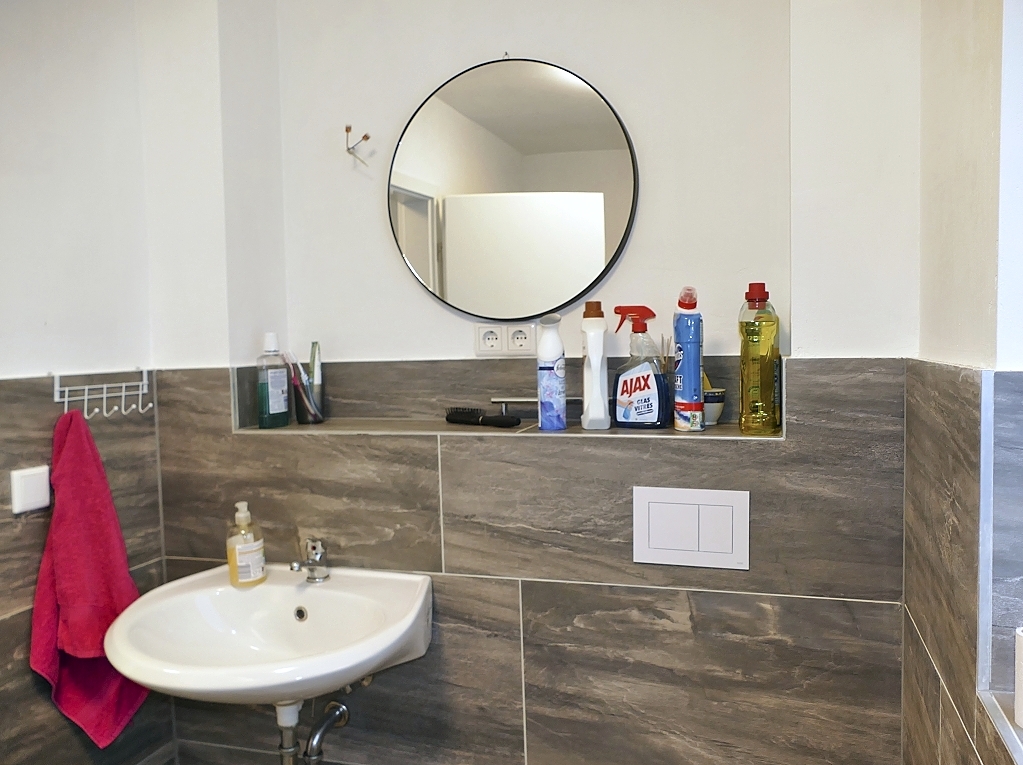 Das zweite Tageslichtbad ist mit einer ebenerdigen Dusche, einem Waschtisch und einem WC ausgestattet.