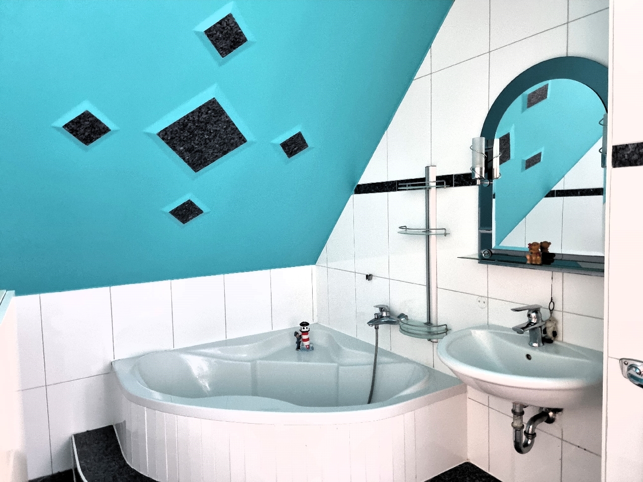 Haupt Bad mit Eckbadewanne, Dusche, Waschtischen und Fenster
